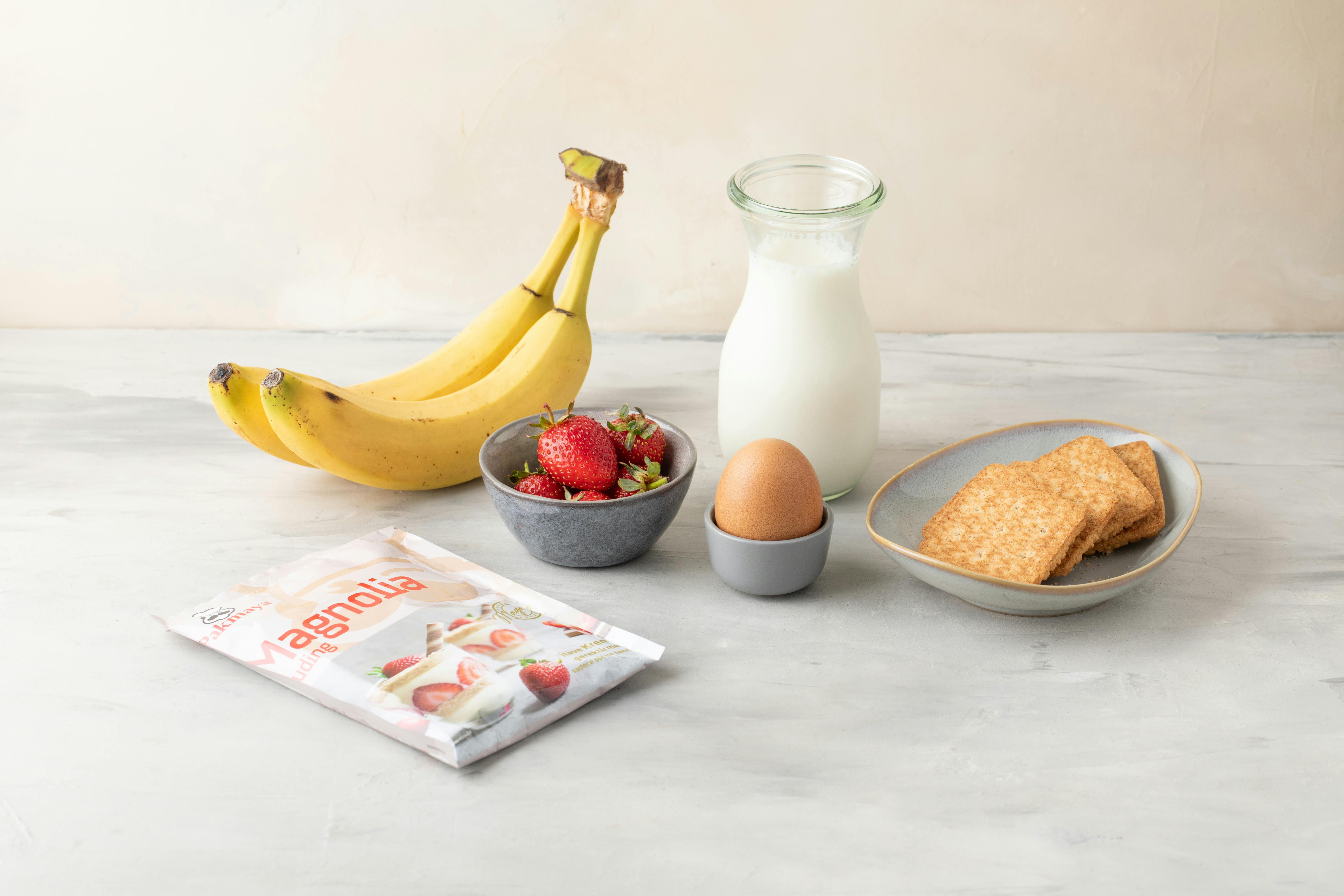 - Servis yapacağınız kupların en alt kısmına ufalanan bisküvileri ekleyin; yan kısımlardan gözükmesi için dik bir şekilde çilek dilimlerini yerleştirin. Üzerine ılımış olan magnolia pudingi dökün. İkinci katman için muz dilimlerini yerleştirin ve üzerine magnolia pudingi dökün.